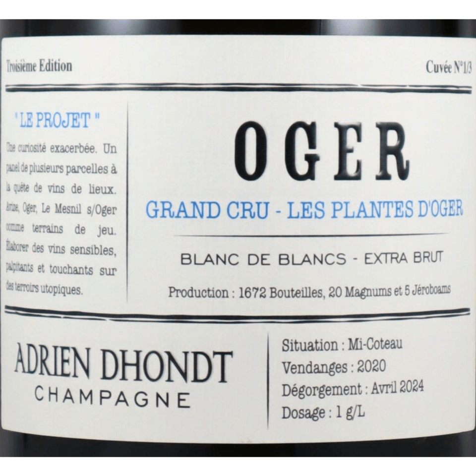 ブラン ド ブランの名手と評判のドント グルレのアドリアンのプロジェクトは特級オジェの単一畑もの。ごく僅少の入荷です。